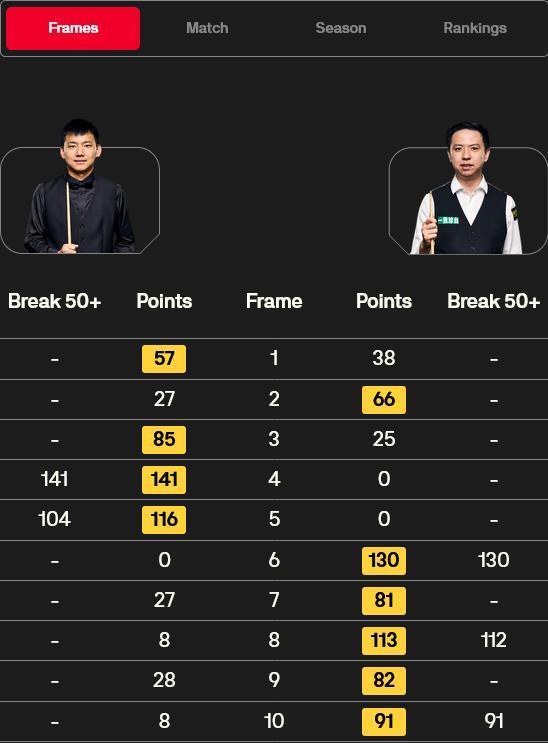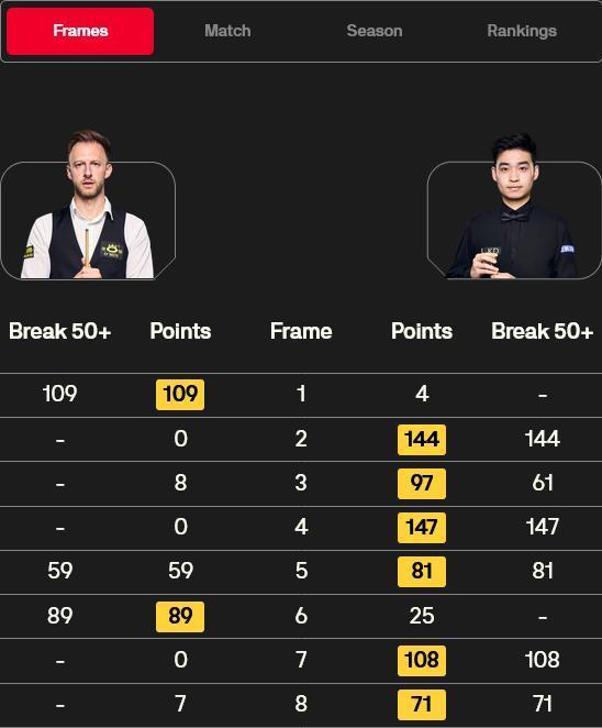 第二时段的第二场半决赛中,卫冕冠军、头号种子贾德-特鲁姆普对阵中国小将斯佳辉。比赛中,“王牌君”最初打出1杆破百,先下一城。关联词尔后,斯佳辉连轰2杆破百和2杆60+,连胜4局,大比分4-1反超。特鲁姆普再轰1杆80+,追回一局。关节技术,斯佳辉再轰1杆破百和1杆70+,连胜2局,大比分6-2见效,晋级决赛。这么,中国选手就包揽了本届赛事冠亚军。此外,斯佳辉在第四局打出了个东说念主干事生存首杆147,亦然赛史首杆147,依然官方纪录的第206杆147。